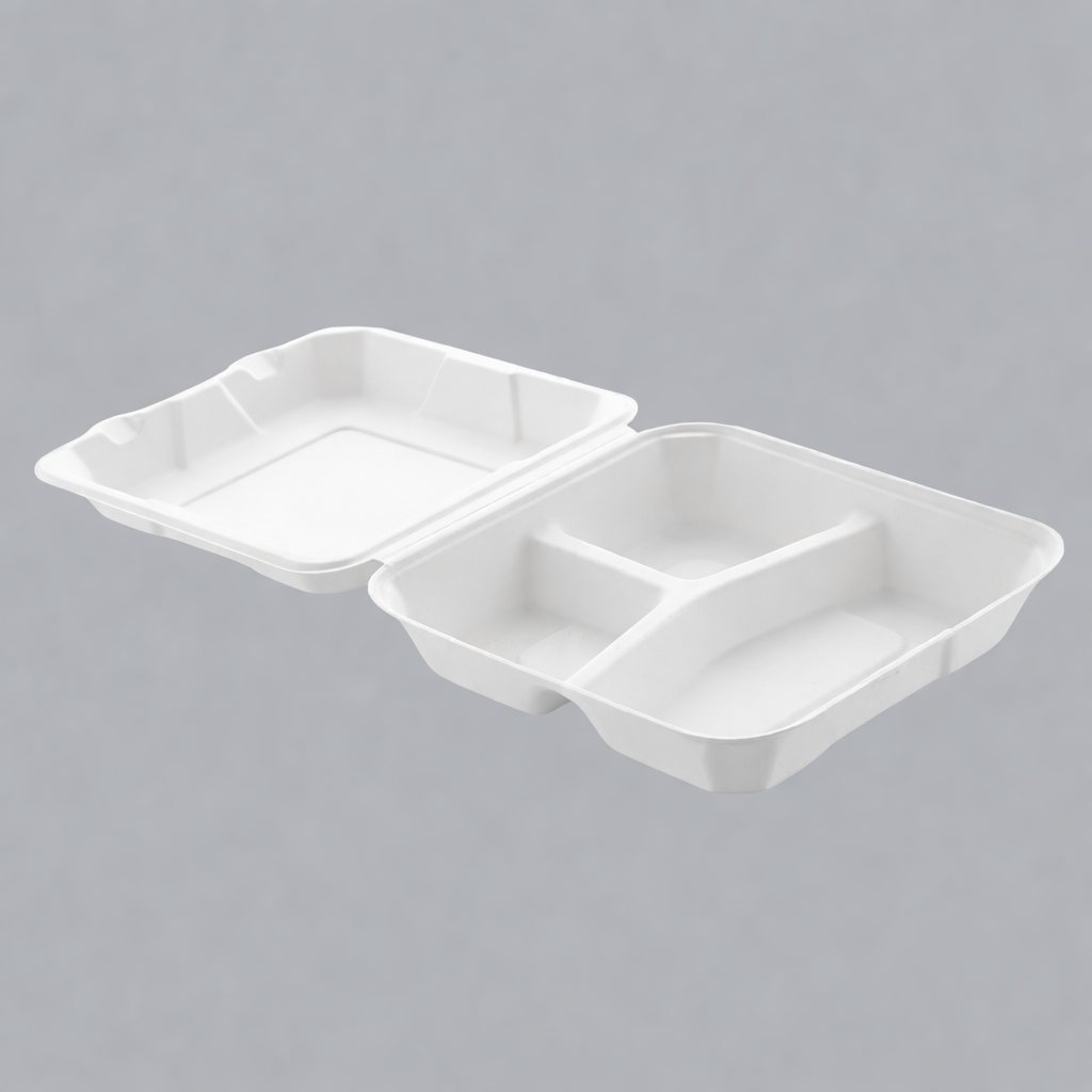 Keep your meals organized and eco-friendly with our 8×8 3-Compartment Clamshell Box. It's made from 100% compostable bagasse and features three well-proportioned sections for mains, sides, and accompaniments. The sturdy design prevents food mixing and keeps everything in place during transport, while the clamshell lid locks in freshness. Microwave- and fridge-safe, this container is ideal for tiffin deliveries, corporate meals, or catering orders that require clean presentation and zero plastic waste.